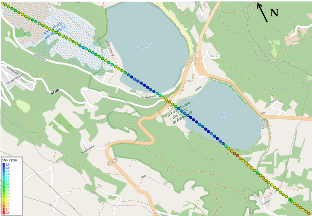 Quantitative measurements validate this expectation: on the water, the SNR ratio assumes values between 0.7 and 1 (the differences are mainly due to the elevation angle and the noise effects), whereas when the specular point is on the terrain, the measured values are very different. Figure 10 shows that for PRN 30, the reflection points out of water are mainly on a forest area (northern points) and on irrigated fields (southern points), showing SNR ratios below 0.2 and between 0.2 and 0.4, respectively. As shown in Figure 11, the reflection points for PRN 13 are southern with respect to PRN 30, and they fall also in the so-called “Area umida dei Mareschi”, i.e., the “Mareschi humid zone”. In that region, as expected, the SNR ratios oscillate in a range between 0.45 and 0.65, sometimes very close to the values assumed on water basins, due to the swamp effect. Then, in the southern region of irrigated fields, again, the measurement is similar to PRN 30, with values between 0.2 and 0.45, with small differences due to the satellite elevation and specular point positions.