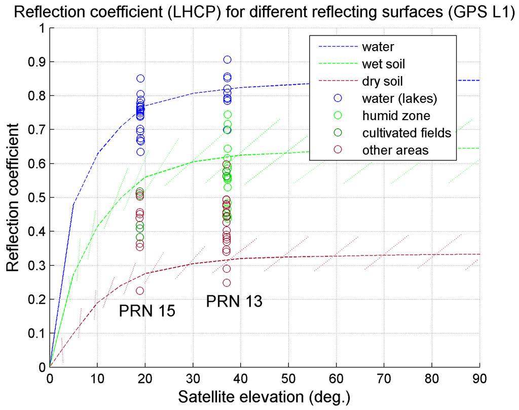 As said above, the reflection index is a function of both the reflecting surface characteristics and the incidence angle; therefore, it can be expressed as a function of the soil dielectric constant and the satellite elevation angle θ: