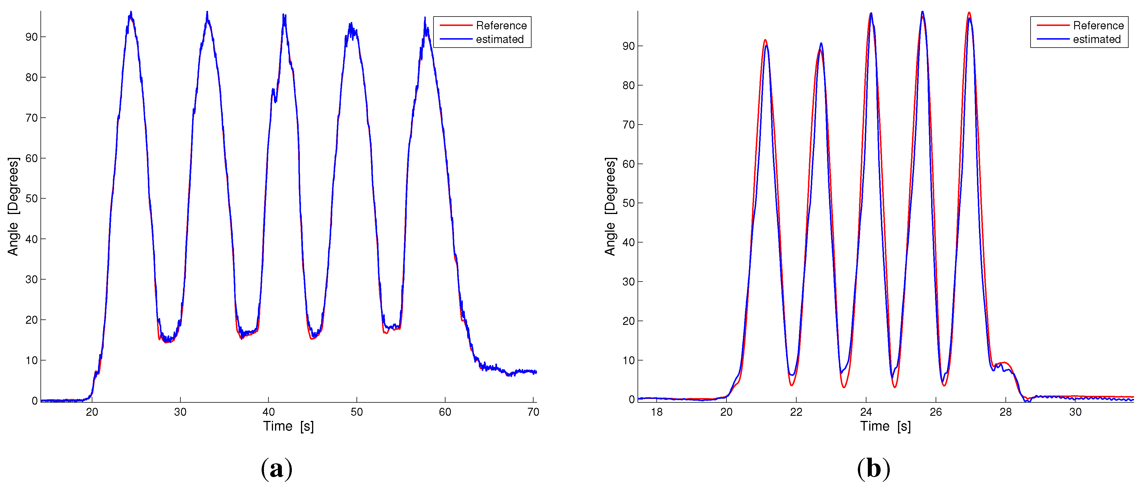 Figure 5 compares the results of our estimation technique and the reference measurement system in two representative plots taken from the slow and fast monopodalic flexion trials (