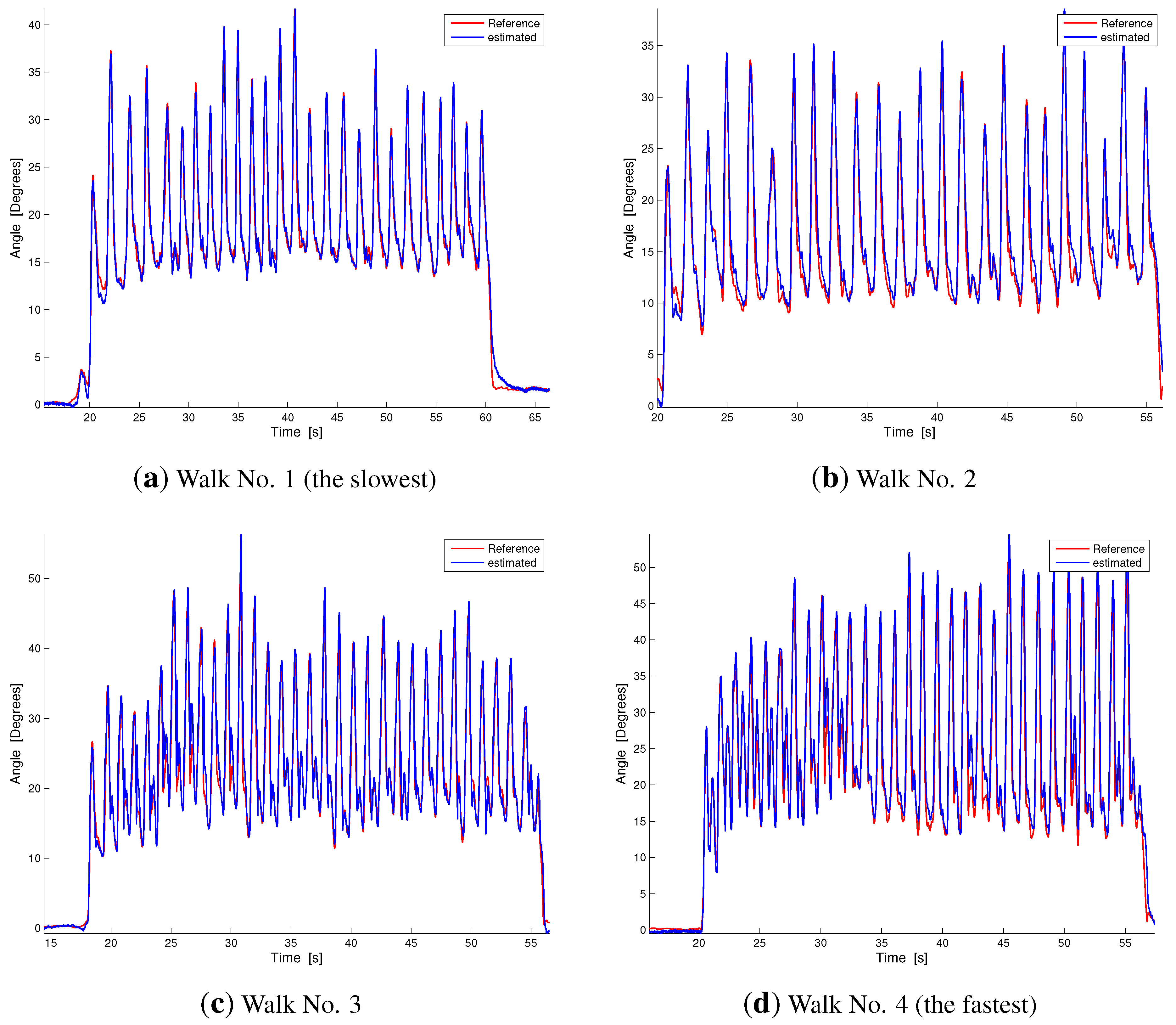 Dynamic comparison between our estimation technique and the reference measurement during walking at different velocities. Velocities increase from (a) to (d). The blue line represents our estimation, while the red line is the reference measurement.