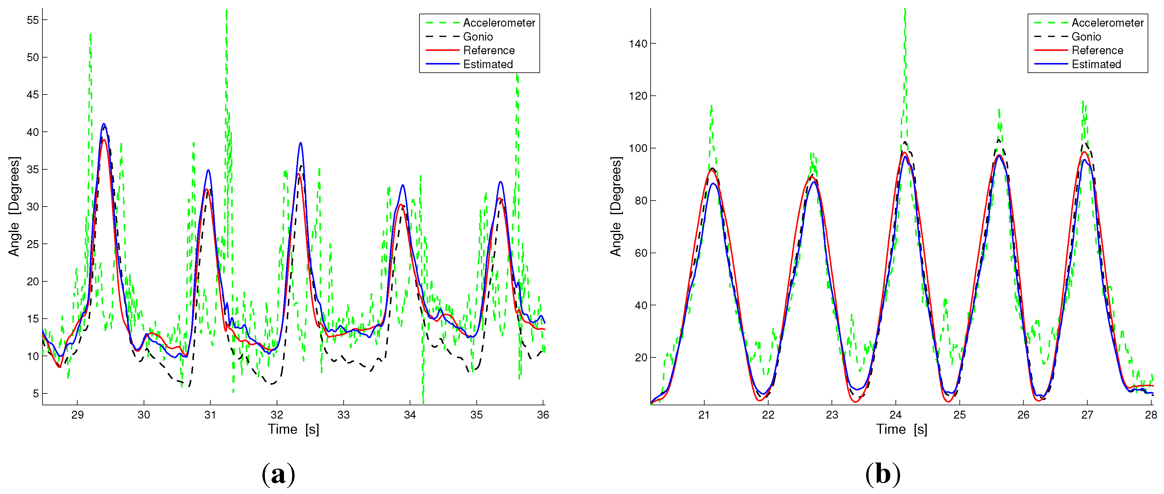 Signal comparison between the angle reconstruction by the accelerometers (green dotted line), the goniometer (black dotted line), the hybrid system (accelerometer + goniometer, blue solid line) and the reference measurement. (a) Walking; (b) Fast flexion.
