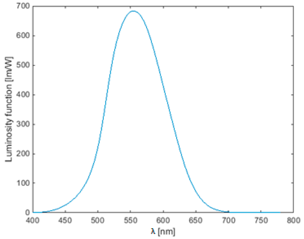 In some cases, the manufacturer provides the luminous intensity distribution for a LED-lens combination. This was the case for the application in this paper. This photometric data was first converted to radiometric units by weighting with the standard luminosity function (see Figure 1). The best fitting Gaussian function (order n) was used for interpolation of the irradiance values: