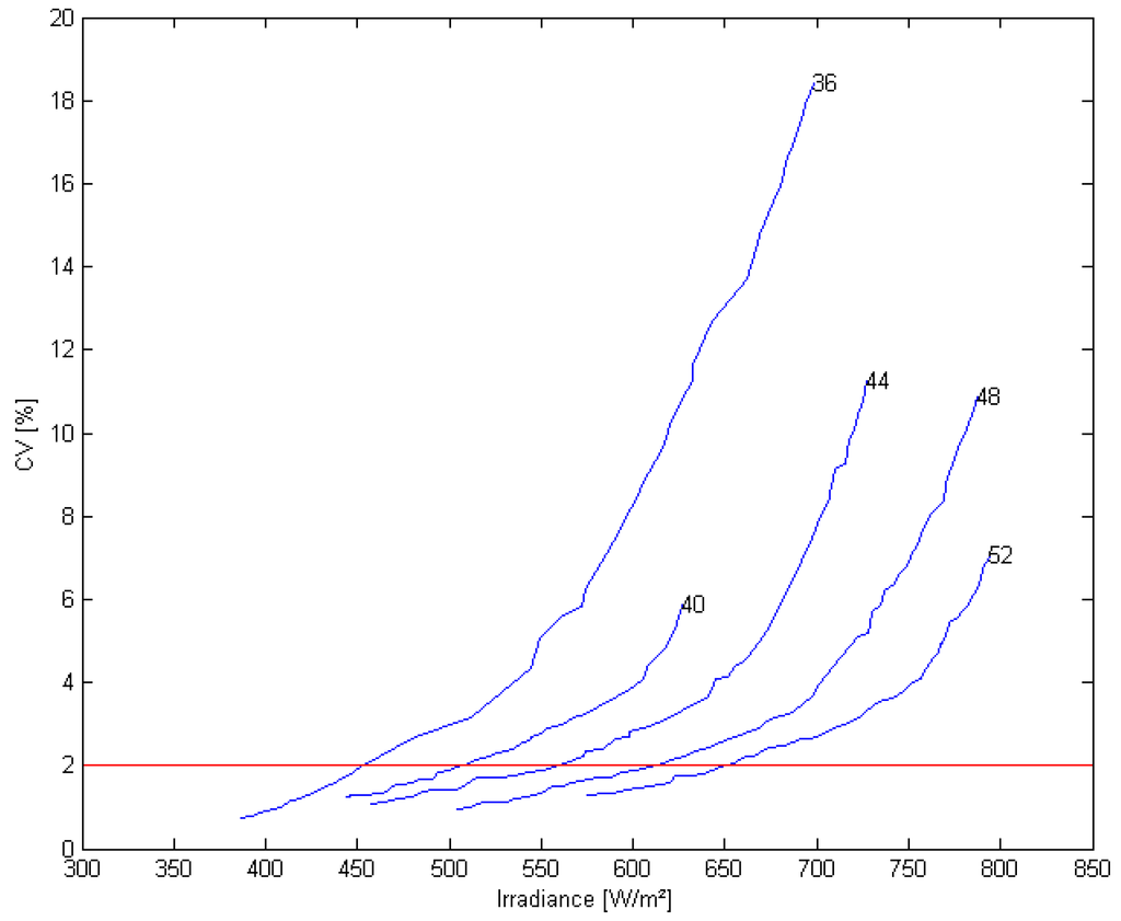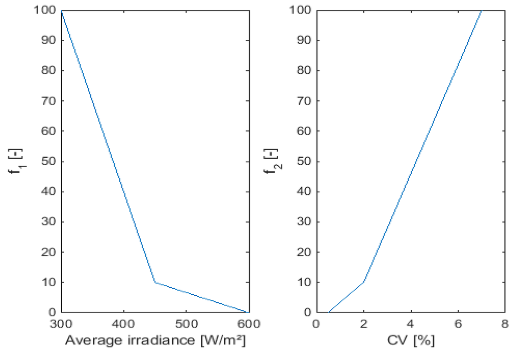 Irradiance levels below the target irradiance level are inferior while irradiance levels above this value are superior, although to a lower degree: < . The objective function for the CV is similar: