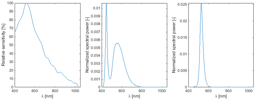 with: the normalized (area under the curve equals 1) radiant power of the LED as a function of the wavelength (W) and the relative spectral sensitivity function of the camera (–).