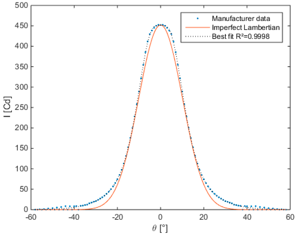 Most authors assume that LEDs have Lambertian distribution patterns, meaning that the luminous intensity is a cosine function of the viewing angle, being the angle off-center (0°) [19]: