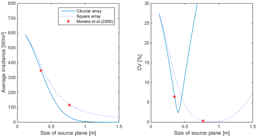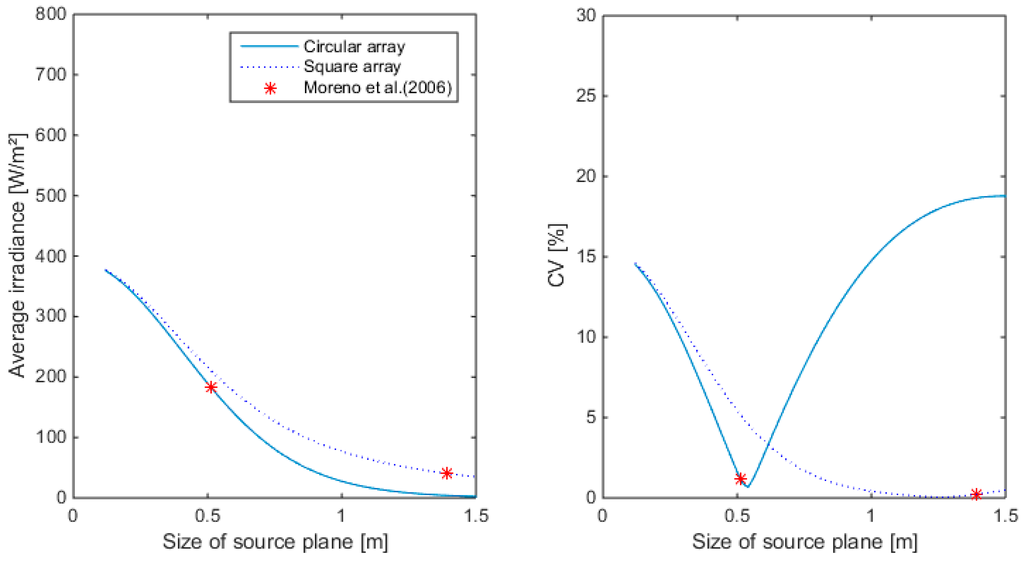 Two different popular configurations were simulated: the square and the circular array. Results for 36 LEDs are illustrated in Figure 7, Figure 8 and Figure 9 for different sizes of the source plane for narrow, medium and wide angle lenses, respectively. The size of the source plane had a large effect on the average irradiance and CV in the target area. When the source plane increased in size, the average irradiance decreased. For both the square and circular array of LEDs, the CV decreases with the size of the source plane, then reaches a minimum and then increases again. For the square array with narrow lenses, the smallest CV value was found at an array size of 0.76 m. Although the CV here was very small (0.76%), the irradiance was too low for this application, since an irradiance of 450 W/m2 was required. The same was found for the medium and wide angle lens. Higher intensity values were found for a smaller source plane size, however, due to the suboptimal overlap between individual LED light distribution patterns, this resulted in a lower uniformity. With the wide angle lens, it is not possible to obtain more than 400 W/m2, not even with the smallest configuration. The lowest CV for the circular array was 5% at an irradiance level of 463.8 W/m2 for the narrow lens. Although the intensity was above the required level, the CV was too high, indicating a low uniformity level. For the medium and wide angle lenses, the intensity at the source plane size with lowest CV was lower than the required level. Generally, it can be seen that in case of a circular array, the intensity drops down faster with increasing source plane size compared to the square array for the same number of LEDs. On Figure 9, it can also be noticed that the CV as calculated by the empirical formula of [19] is not the minimum CV for a square and circular array. This can be attributed to the fact that the central region which is illuminated uniformly is different from the target area considered in this paper. For 36 LEDs, the narrow angle lens seems to be the only one appropriate for this application.