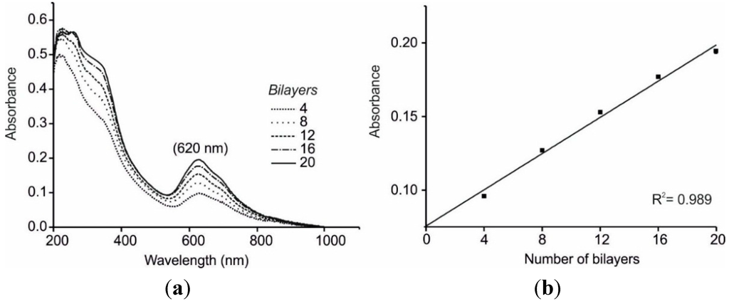 The growth of LbL films was monitored with UV-Vis absorption spectroscopy (UV-2600 model, purchased from Shimadzu, Kyoto, Japan) by testing the linearity between the number of layers deposited and the absorbance.