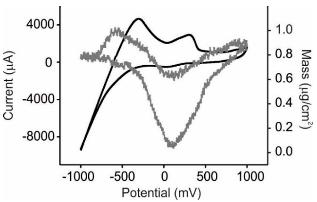 Electrochemical quartz crystal microbalance experiments were carried out with a quartz crystal microbalance (QCM200 + QCM25 Crystal Oscillator, purchased from Standford Research Systems, Sunnyvale, CA, USA) connected to a Parstat 2273 potentiostat/galvanostat (EG&G, Oak Ridge, TN, USA). The mass-sensitive oscillators were 2.54 cm diameter, 5 MHz AT-cut planoconvex quartz crystals coated with platinum.