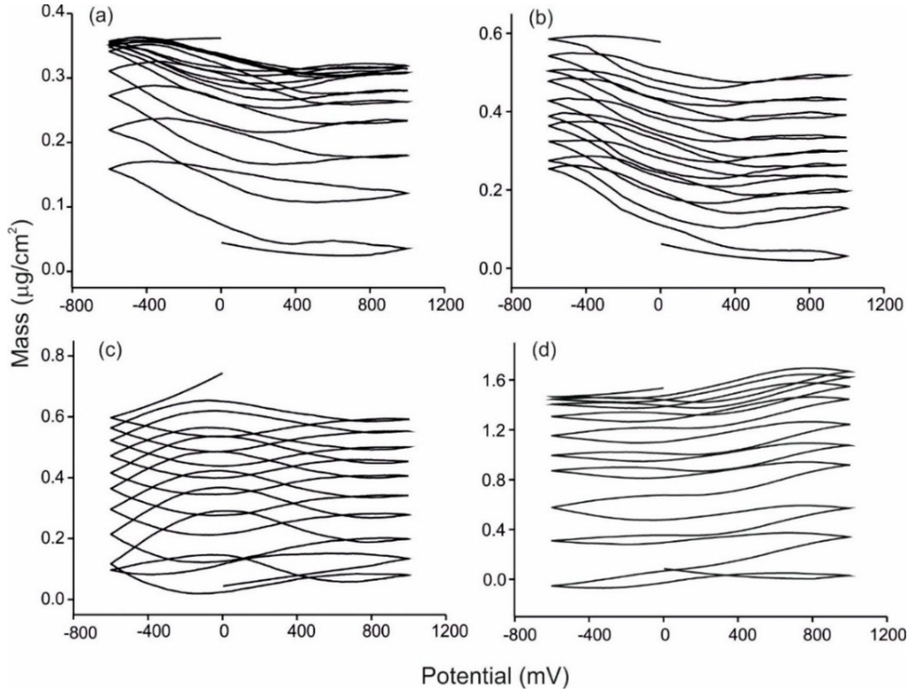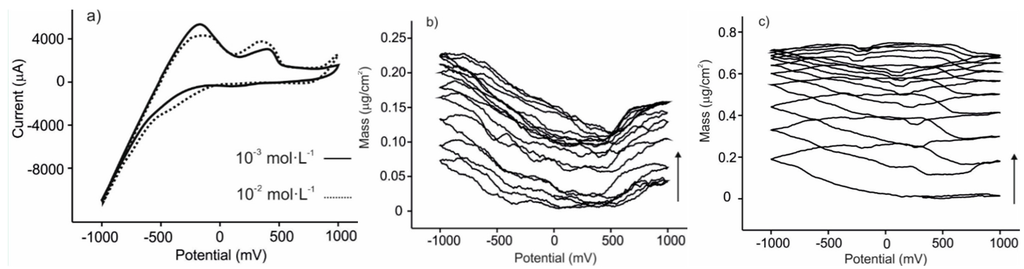 Cyclic voltammetry was carried out using a conventional three-electrode cell. The reference electrode was Ag|AgCl/KCl 3 mol·L−1 and the counter electrode was a platinum sheet with a surface of 1 cm2. Cyclic voltammograms were registered at a sweep rate of 0.1 V·s−1. The variations of mass taking place simultaneously to the cyclic voltammetry experiment were registered. All the samples were measured seven times with each sensor to check the robustness of the experiments.