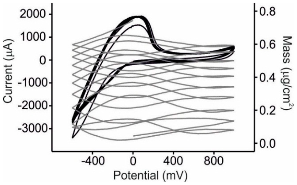 Apart from their sub-nanogram sensitivity, another possible advantage of QCM sensors for the analysis of liquids, is that the same device can be used to obtain simultaneously mass changes and electrochemical signals. For this reason, the Electrochemical Quartz Crystal Microbalance (EQCM) has become a well-established technique for the investigation of mass changes associated with electrochemical surface processes such as adsorption of enzymes [43], electrodeposition [44], electropolymerization [45], ion insertion [46] or redox processes [33]. In this way, EQCM can provide higher amounts of information about a sample than electrochemistry or mass measurements performed separately [33,47,48].