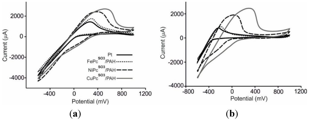 Also in this case, the peak position shifted to more negative values when advancing in the transition metal series (−0.25 V for FePcSO3/PAH, −0.35 V for NiPcSO3/PAH and −0.42 for CuPcSO3/PAH sensor and −0.45 for the Pt bare electrode), confirming the electrocatalytic effect of the nanostructured films.