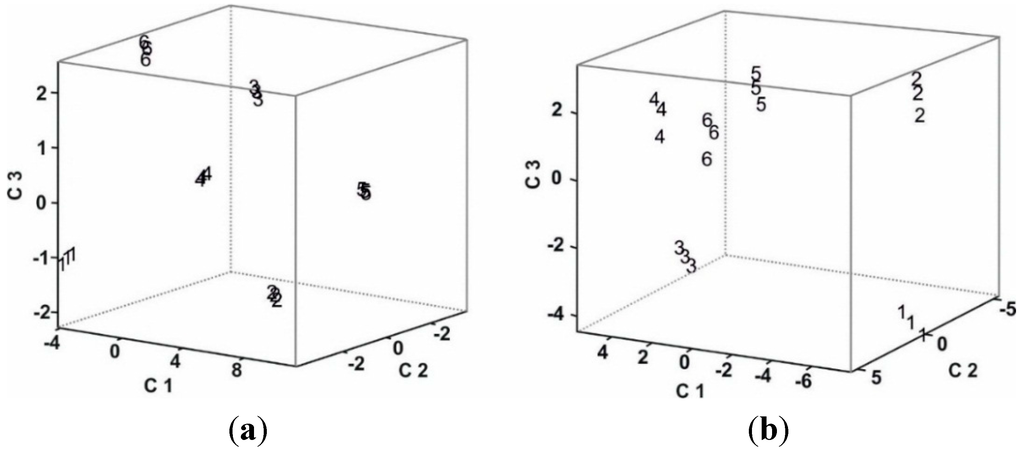 PARAFAC scores plot of the array obtained from (a) The voltammetric responses; (b) The mass responses. Must samples are 1: Prieto Picudo; 2: Garnacha; 3: Cabernet Saugvinon; 4: Tempranillo; 5: Juan García; and 6: Mencía Regadío.
