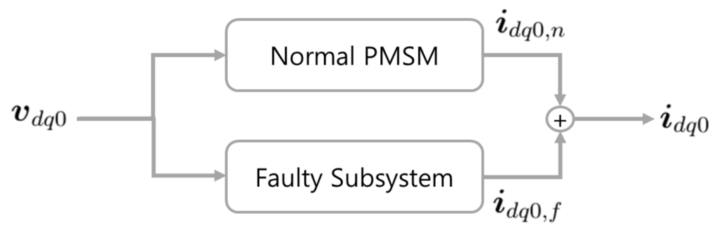 where ω is the electrical angular velocity of the PMSM, and idq0,f = Tpark × pKμif. Let idq0,n be defined as idq0 − idq0,f. Then, Equation (7) is the same as the model equation for a normal PMSM with stator currents idq0,n. When the stator voltages are given, idq0,f is uniquely determined from Equation (5) or (6) with Tpark, and also idq0,n from Equation (7). This implies that idq0,n and idq0,f can be considered as states that are independent of each other, and therefore, the faulty PMSM system can be divided into two subsystems, as shown in Figure 2. The "Faulty Subsystem" is described by Equation (5) or (6), and the “Normal PMSM” by Equation (7).