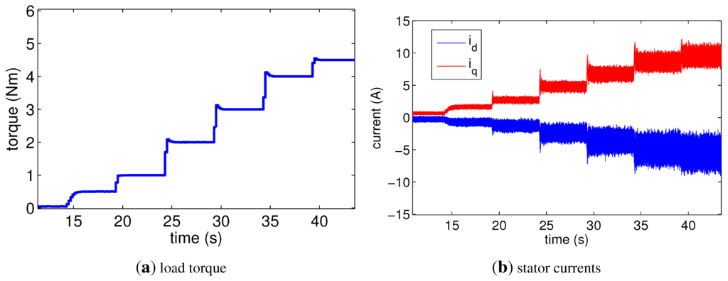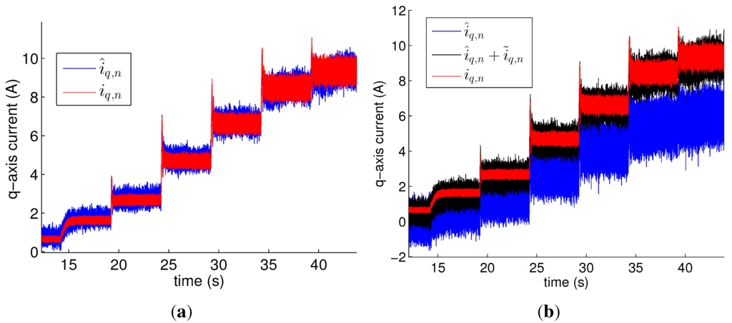 Figure 6 depicts the estimation results obtained by the open-loop observer for iq,n for the healthy motor. As shown in Figure 6a, the plot for the estimated values was close to that for the measured values when the observer had used the accurate parameters in Table 1. Their DC components were almost equal, but a difference in the AC components appeared and varied within ±1 A. This estimation error cannot be eliminated because the faulty model has uncertainty. Figure 6b shows that had significant estimation errors when the observer used wrong values such as mH, mH, and Wb. However, the errors were significantly reduced as in Equation (17) was added to .