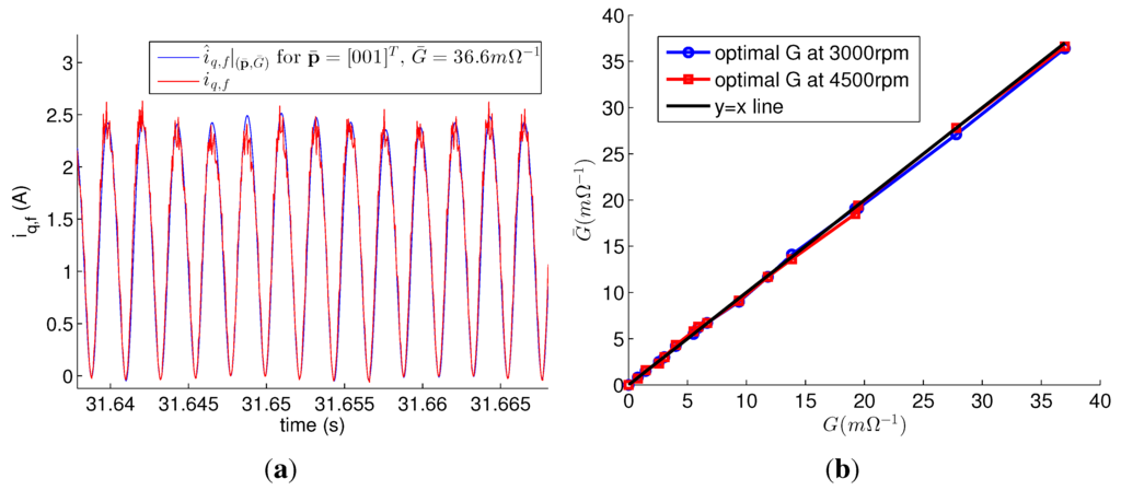 (a) for , mΩ−1, and the measurement data iq,f of faulty motor under the fault p = [0 0 1]T, G = 37.0 mΩ−1; (b) Optimal for the different fault severities and speeds.