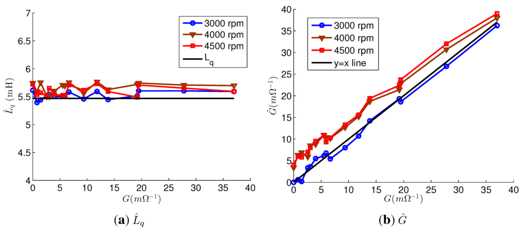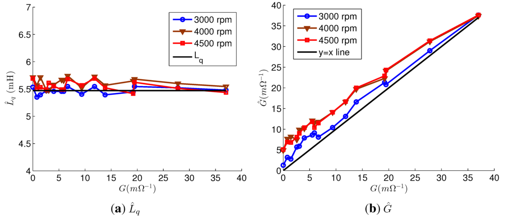 This process estimates p, G and Lq in the least-squares sense. Because iq,f = iq − iq,n, (p, G) equals the optimal solution, which minimizes the cost function . from Equation (17) is added in the cost function to compensate the estimation error of . Therefore, the following problem can be used for parameter estimation: