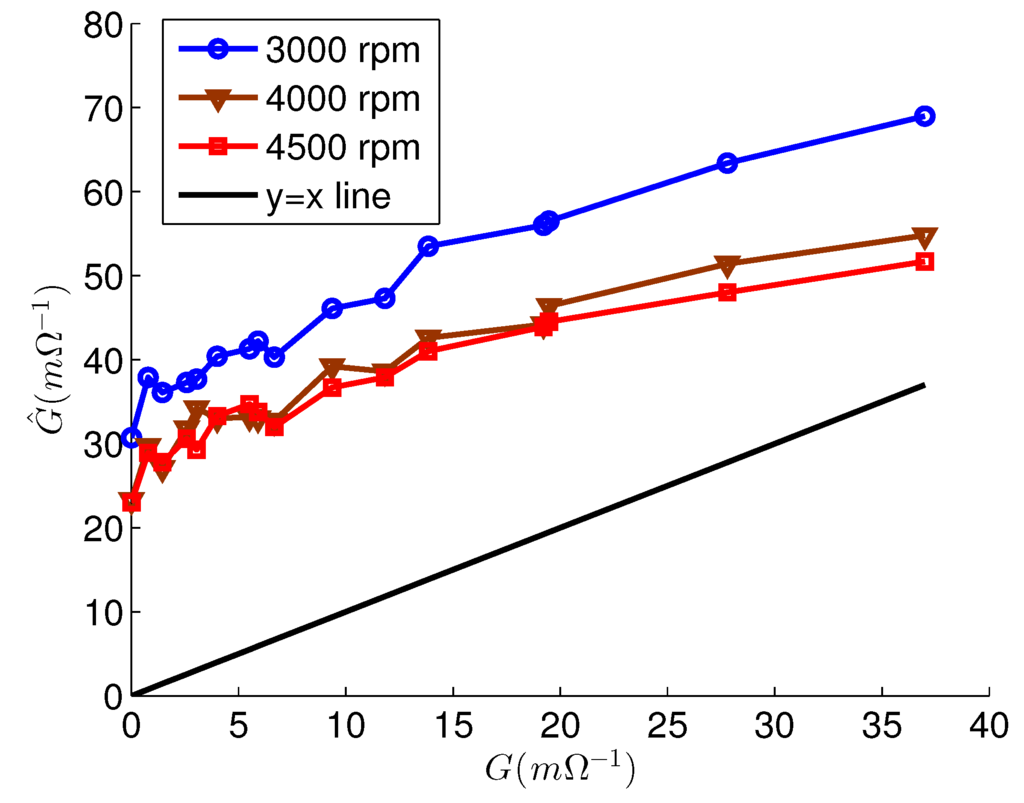 Figure 7a shows iq,f and for and mΩ−1 obtained by the observer for iq,f with accurate values of the parameters. iq,f was calculated from its definition with measured data of if in the faulty motor. The faulty condition was G = 37.0 mΩ−1 (Rf = 0.22 Ω, μ = 15/20). for mΩ−1 was the optimal solution to minimize , and was almost the same as iq,f. Figure 7b shows the values of the optimal solution for different fault severities and speeds. Every optimal almost equals G. In addition, the faulty phases according to the optimal were all phase c in both speed, except for the healthy motor.