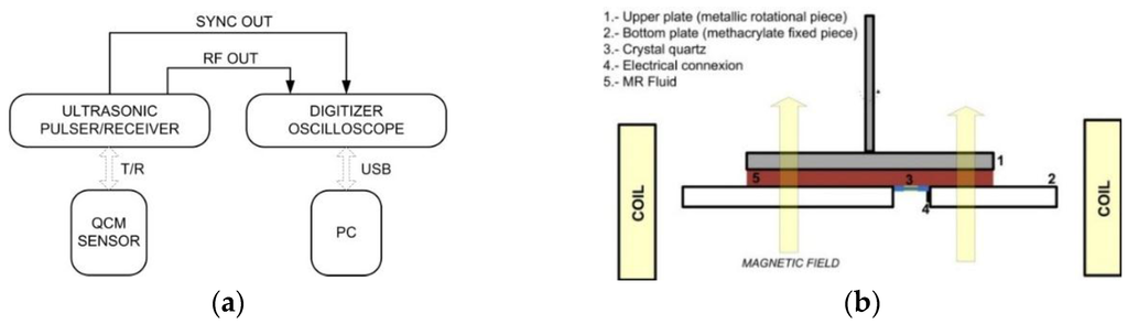 As research progressed, it turned out that TSM resonators are not only sensitive to mass or thickness changes, but also to changes in the viscoelastic properties of the layer system [11]. Even more relevant to the topic of this work is the fact that the device is also sensitive to changes in the rigidity of contacts between particles and the resonator surface [12,13]. The ability to probe contact stiffness is critical to the use of such sensors for the characterization of MR fluids [1]. The sensitivity of the TSM devices provides new insights into these attractive and complex materials, which have not been previously studied with this technique.