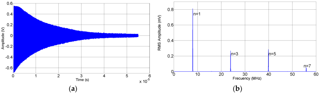 Figure 3 shows the waveform of the signal displayed on the oscilloscope (a) and its frequency spectrum (b). To determine the resonant frequencies a temporal interval (from 95% to 25% of signal) was selected. The signals were multiplied by a Hanning window that was zero-valued outside of the selected interval. The resonant frequencies were calculated from the maximum values of the zero-padded Fast Fourier Transform (FFT). The determination of these quantities was performed by using a cubic spline data interpolation (with steps of 10 Hz multiplied by p1/2, with p = (n + 1)/2, where n is the overtone order), in an interval centered at the resonance frequency with a variable span depending on the harmonic (2 MHz multiplied by p1/2).