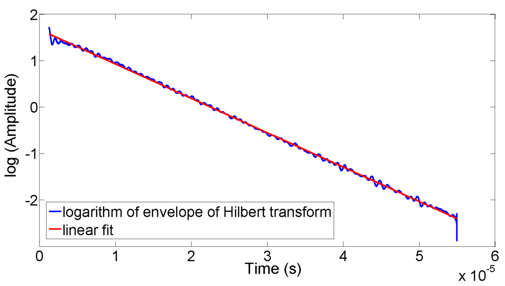 After removing the DC offset, the output signals of each harmonic were separated applying a filter with 0.01 dB of peak-to-peak ripple and a minimum stopband attenuation of 40 dB. Subsequently, the spectral data were converted back to the time domain via the inverse FFT (via Hilbert transform). The envelopes of the ‘monochromatic’ signals were obtained from the amplitude of the resulting complex time signal. Since these envelopes were not subject to a pure exponential decay, only an intermediate range of the curves were fitted to an exponential function (the interval goes from 95% to 5% of signal). Figure 4 shows an example of a linear fit to the logarithm of the signal previously mentioned.