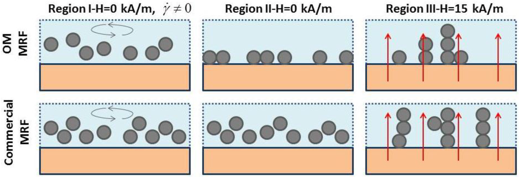 Figure 5 shows a scheme of the possible structures formed in OM MRF and in the commercial MRF for the three different regions. When the system is at rest with no magnetic field applied (center), particles settle (OM MRF) or remain suspended (commercial MRF). When applying a magnetic field (right), one forms a chain-like structure with chains aligned to the field (vertical direction).