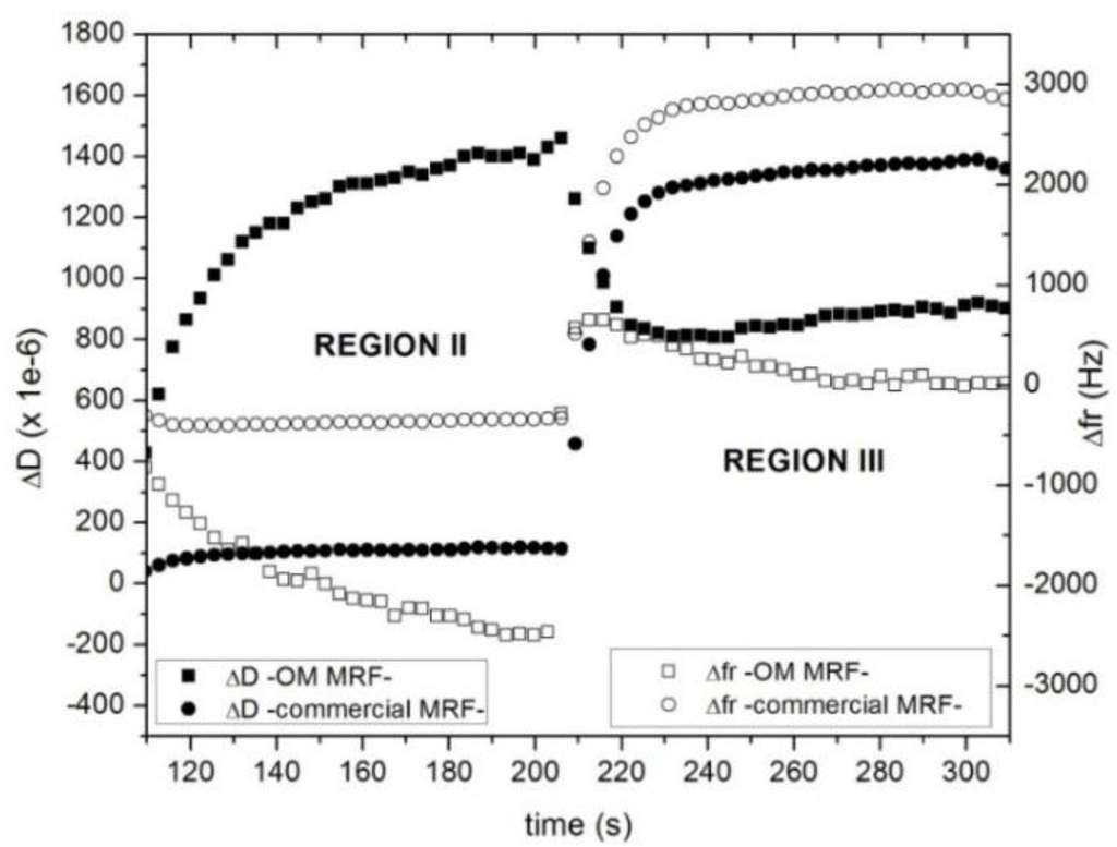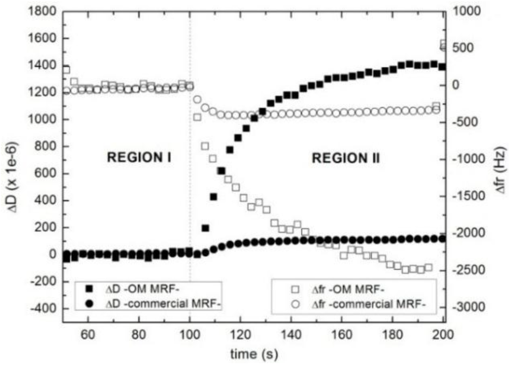 Figure 6 shows the changes in dissipation (ΔD) and the resonance frequency shifts (Δfr) during the pre-shear stage (region I) and the rest stage (region II) of OM MRF (squares) and the commercial MRF (circles). While shear is applied (region I), Δf and ΔD remain constant. The shear flow distributes particles evenly in the fluid volume, so that the system behaves like a fluid. The sensor sees a fluid with average properties that are constant in space and time.