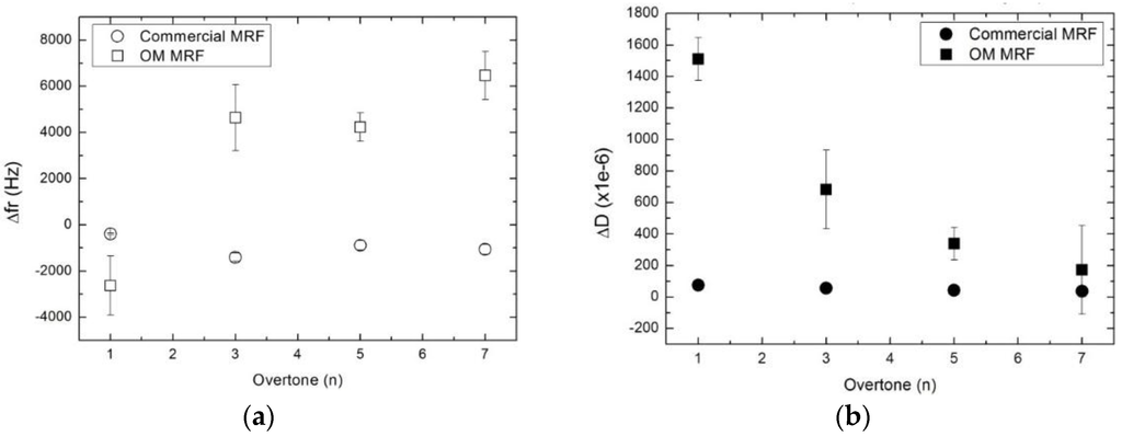 There is a second effect, which is only observed in the case of the commercial MRF. The thixotropic agents prevent the commercial suspension from settling. Rather, the cessation of shear leads to an increase in the viscosity as a result of the strong shear-thinning character of this material. This is the most plausible explanation for the changes observed in Δfr and ΔD seen for this MR fluid. Note that this process is completed in about 10 s (circles in Figure 6), while the sedimentation proceeds all through stage II. This interpretation is corroborated by the overtone dependence of Δfr and ΔD shown in Figure 7. For the OM MRF, Δfr crosses from negative to positive between the fundamental frequency and the higher overtones, as is characteristic for the coupled resonance (Figure 1). At the same time, ΔD decreases with overtone order, which also agrees with this picture. For a more detailed justification of the last statement, see Ref. [3] and also references [24,25]. In contrast, Δfr is negative at all overtone orders for the commercial MRF. Clearly, there is no coupled resonance in this case. Rather, the material behaves a semi-infinite viscoelastic medium. The particles in this fluid are suspended instead of being settled down.