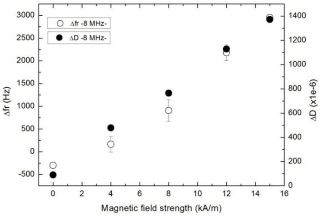 Change in dissipation (solid) and in resonance frequency (open) as a function of the magnetic field intensity applied to the commercial MRF at 8 MHz.