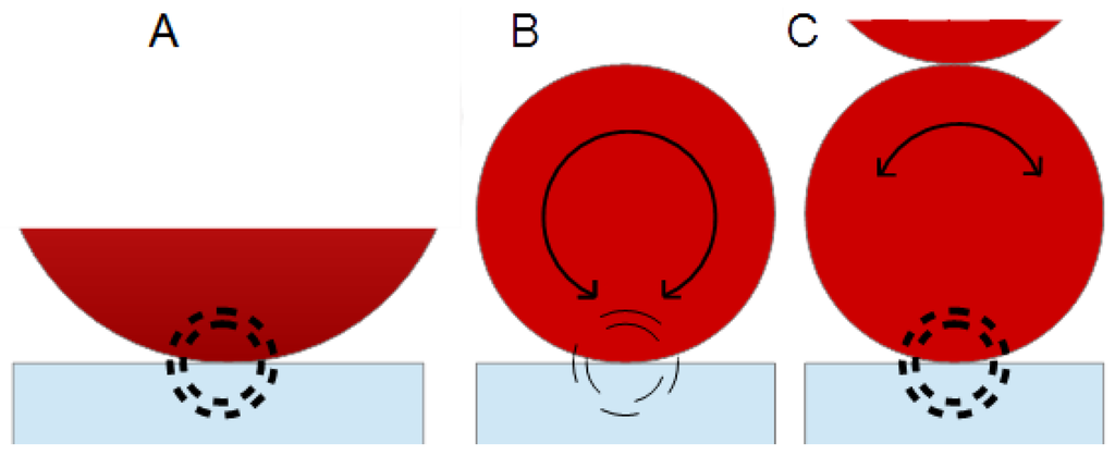 Scheme of particle-surface interaction. (A) A particle at rest; (B) particles which can rotate; and (C) a particle, the rotation of which is hindered by the presence of second particle touching it at the top (which is part of the same chain-like structure).