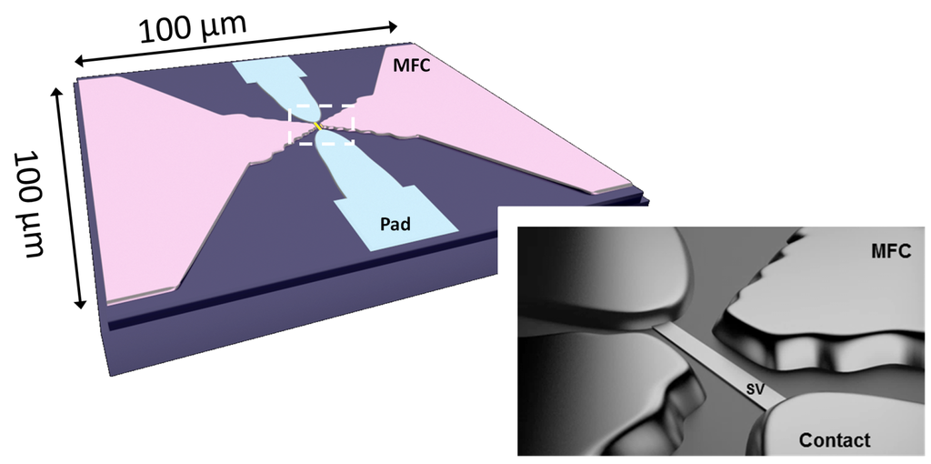 Illustrations of the final device layout including the spin-valve (SV) nanosensor, the electrical contacts and the magnetic flux concentrators (MFCs), all within 100 μm by 100 μm area.
