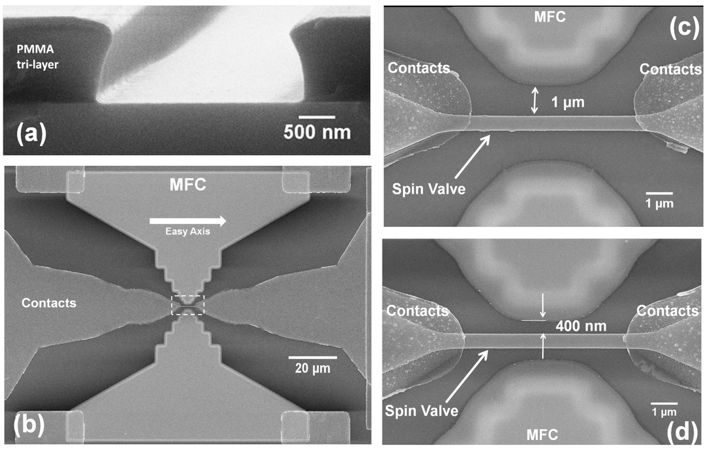(a) Cross section SEM view of the tri-layer PMMA after electron beam lithography (EBL) exposure and development; (b) SEM top view of the full device and (c,d) detailed view of the largest and smallest gaps and sensor to pole distances fabricated using this strategy.