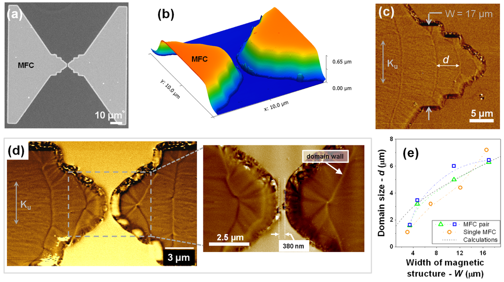 Figure 3e displays a consistent trend between the domain width measured from the MFM images and their theoretical size estimated for closure domain structures. For the latter, the domain width (