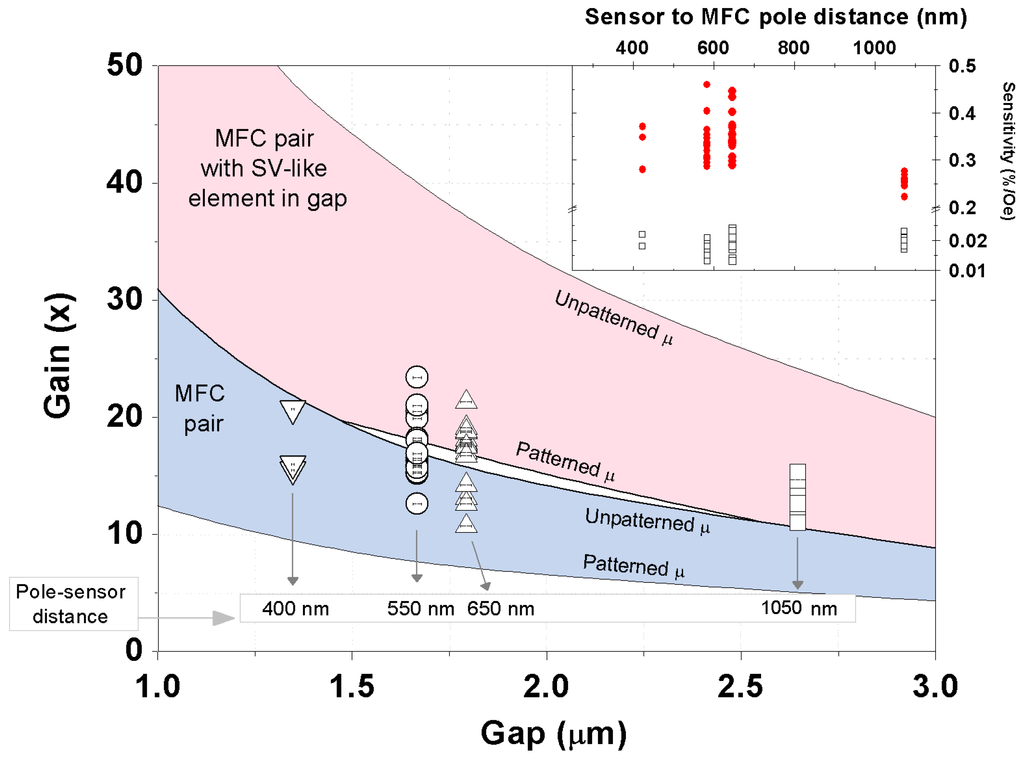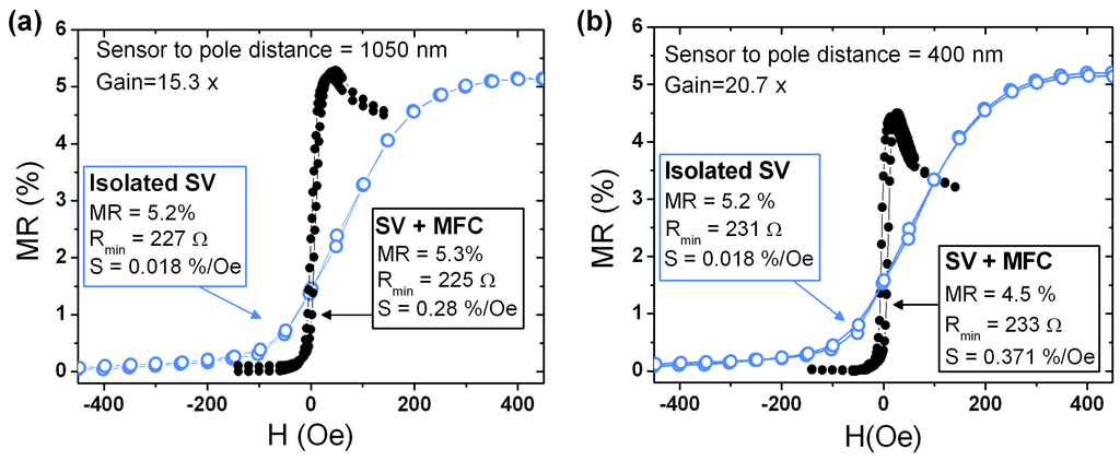 Figure 4a). A maximum gain of 20.7 was obtained for the smallest pole-sensor distance of 400 nm, yielding a sensitivity of 0.37%/Oe, increasing from 0.018%/Oe achieved in the isolated SV (