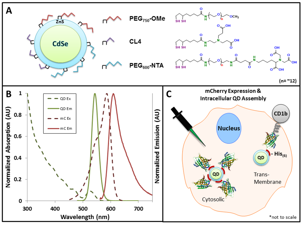 Fluorescent materials and Förster resonance energy transfer (FRET) rationale used in this study. (A) Schematic of CdSe-ZnS core-shell quantum dots (QDs) and various capping ligands; (B) Absorption and emission spectra of the QD and mCherry (mC) donor–acceptor pair showing significant overlap of the QD emission and mCherry absorption, allowing for FRET-sensitized emission of mCherry; (C) Intracellular QD-mCherry assembly strategies. mCherry was expressed either free in the cytosol or as a fusion to the C-terminus of the transmembrane receptor, CD1b. Upon microinjection of QDs, a His6 motif on the C-terminus of the mCherry drove the intracellular assembly of mCherry to the QD surface either in the cytosol or at the cytofacial leaflet of the plasma membrane.