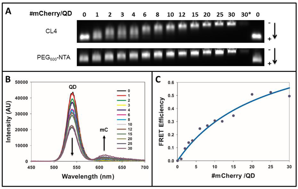 Gel electrophoresis (1% low EEO agarose) was performed on DHLA-PEG600-NTA and CL4 QDs assembled with mCherry protein to demonstrate ratiommetric assembly. QDs (7.5 pmol) were complexed with increasing ratios of mCherry protein in DPBS at QD-mCherry ratios ranging from 1:1 to 1:30 and allowed to incubate for 30 min. Additionally, an mCherry only control was included at the 1:30 mCherry equivalent. QD-protein mixtures were subjected to electrophoresis for 30 min and images were taken at 5 min intervals.