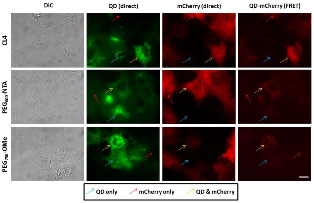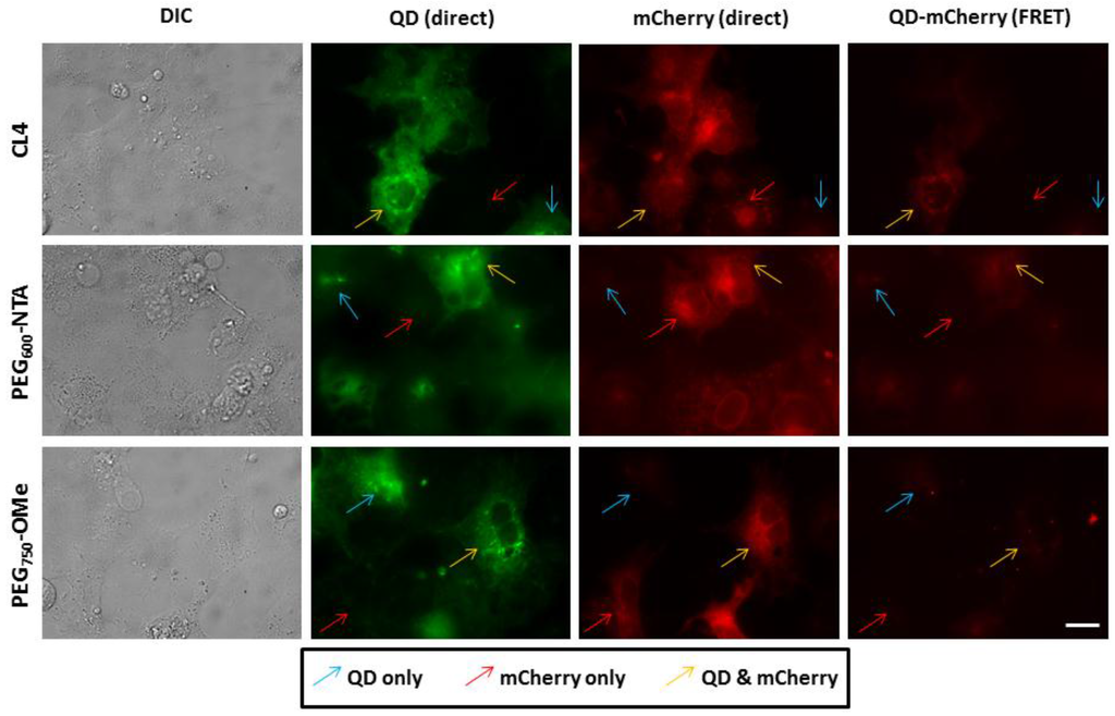 Cytosolic assembly of QDs and mCherry. COS-1 cells expressing His6-terminated cytosolic mCherry proteins were microinjected with QDs coated with CL4, PEG600-NTA and PEG750-OMe. Fields were specifically imaged where cells contained mCherry only (red arrow), QDs only (blue arrow) or both QD and mCherry (yellow arrow) to allow for the appropriate FRET imaging controls. Note the level of efficient FRET present in cells injected with the CL4 QDs, with slightly less efficient FRET observed in cells injected with PEG600-NTA QDs. PEG750-OMe QDs appeared to mediate the least efficient FRET with intracellular mCherry. Scale bar is 20 µm.