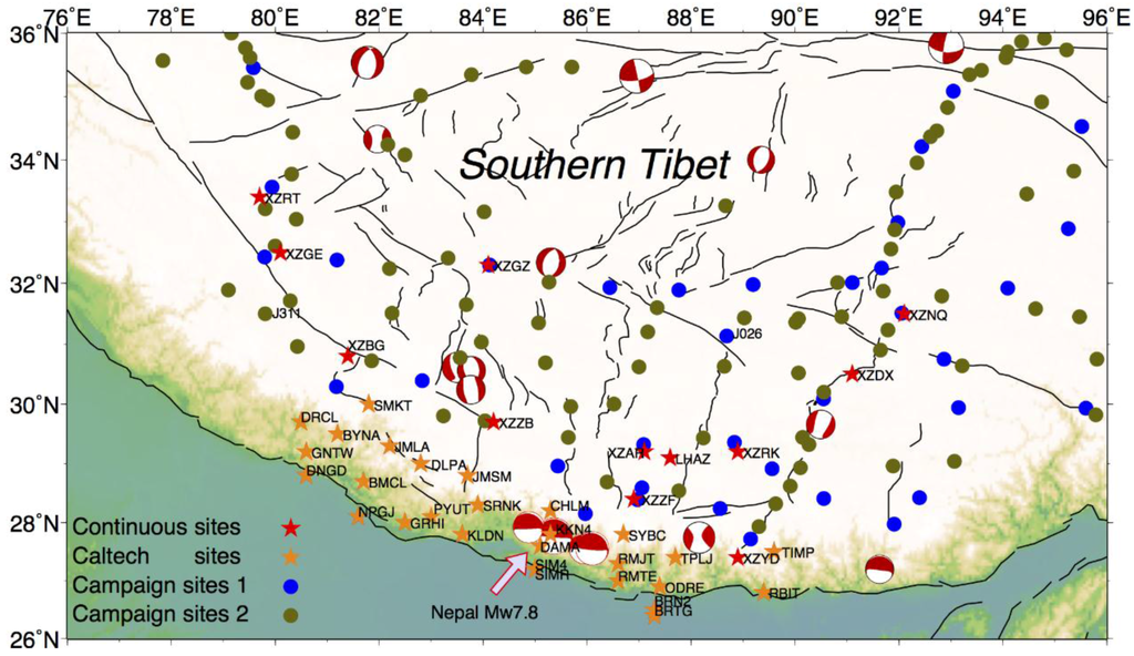 - Chen, Q.; Freymueller, J.T.; Yang, Z.; Xu, C.; Jiang, W.; Wang, Q.; Liu, J. Spatially variable extension in southern Tibet based on GPS measurements. J. Geophys. Res. 2004. [Google Scholar] [CrossRef]