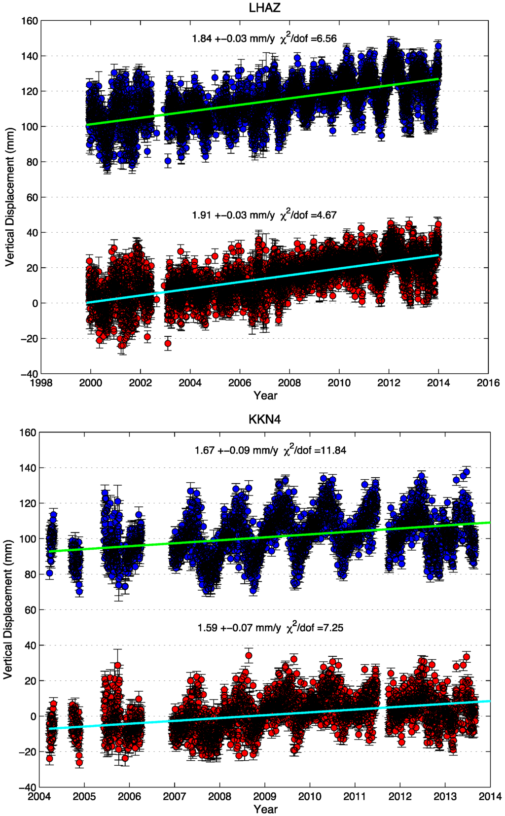 - Fu, Y.; Freymueller, J.T. Seasonal and long-term vertical deformation in the Nepal Himalaya constrained by GPS and GRACE measurements. J. Geophys. Res. 2012, 117, B03407. [Google Scholar] [CrossRef]