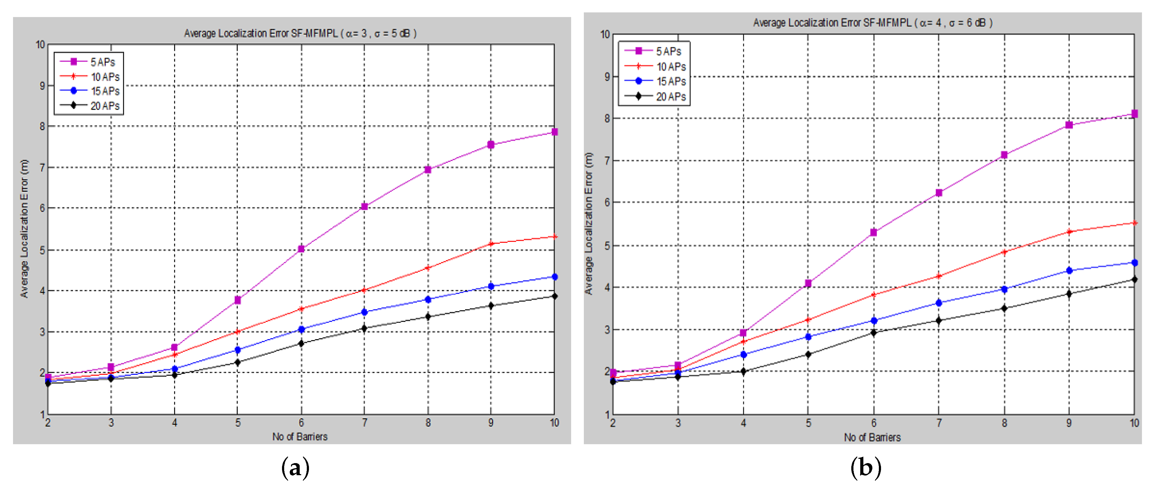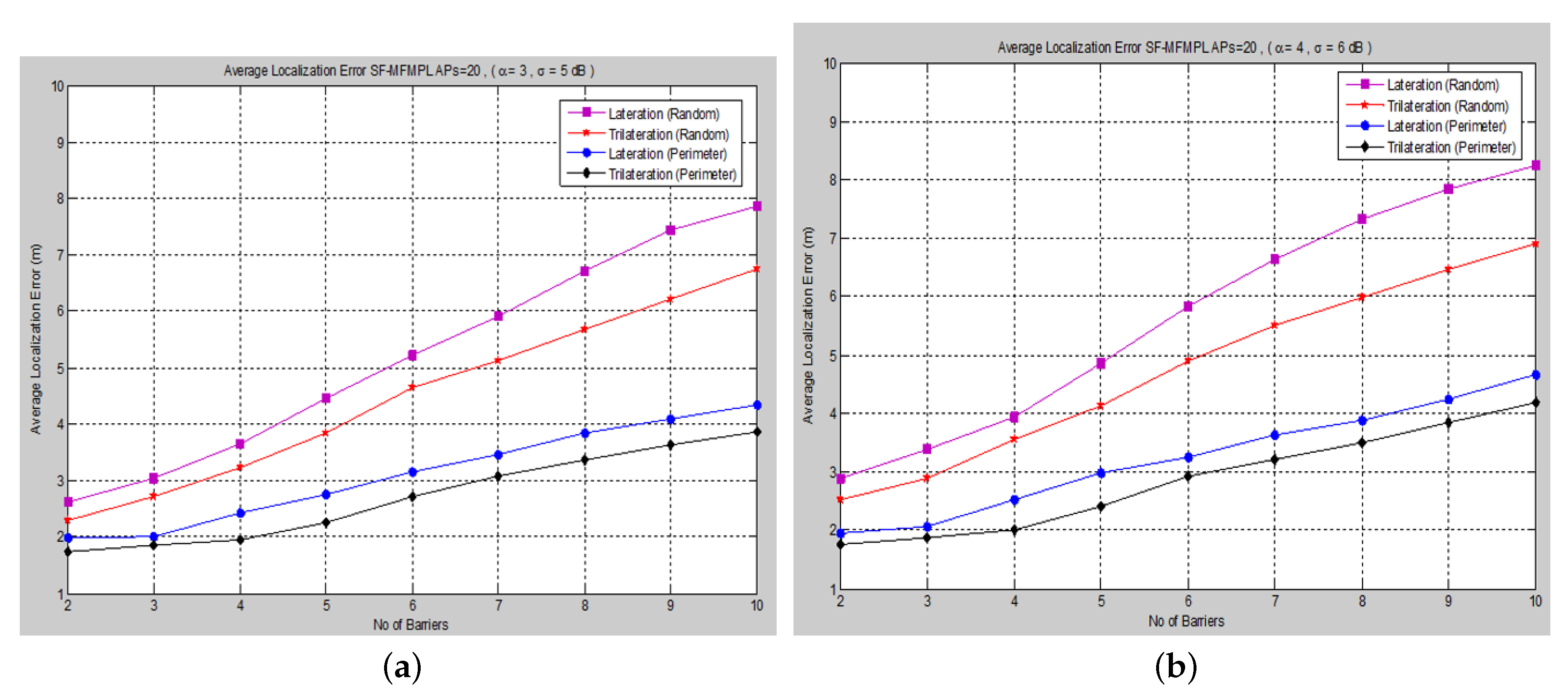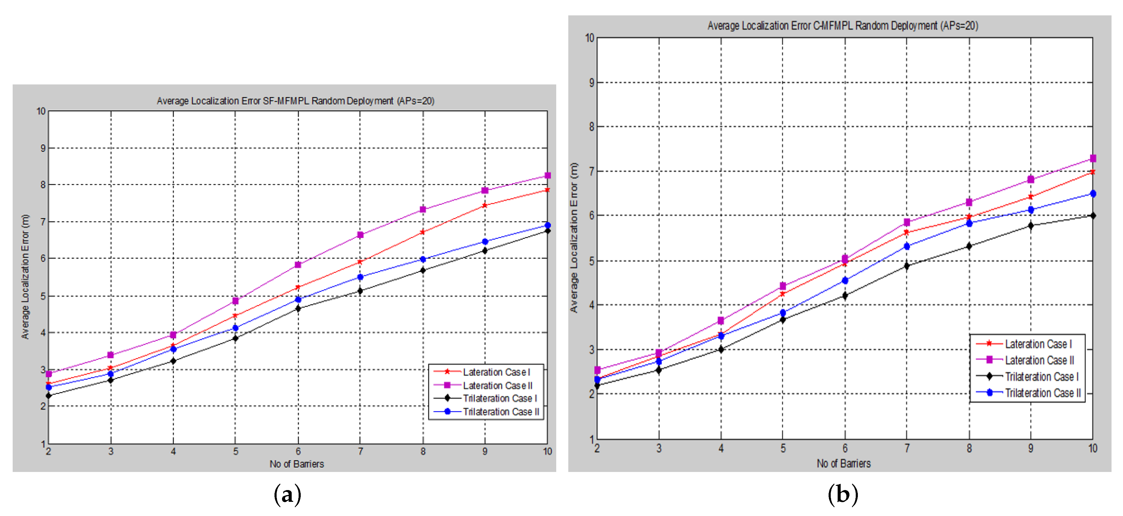 Figure 13. Localization error versus the number of barriers for a random placement configuration of APs. (a) SF-MFMPL; (b) C-MFMPL.