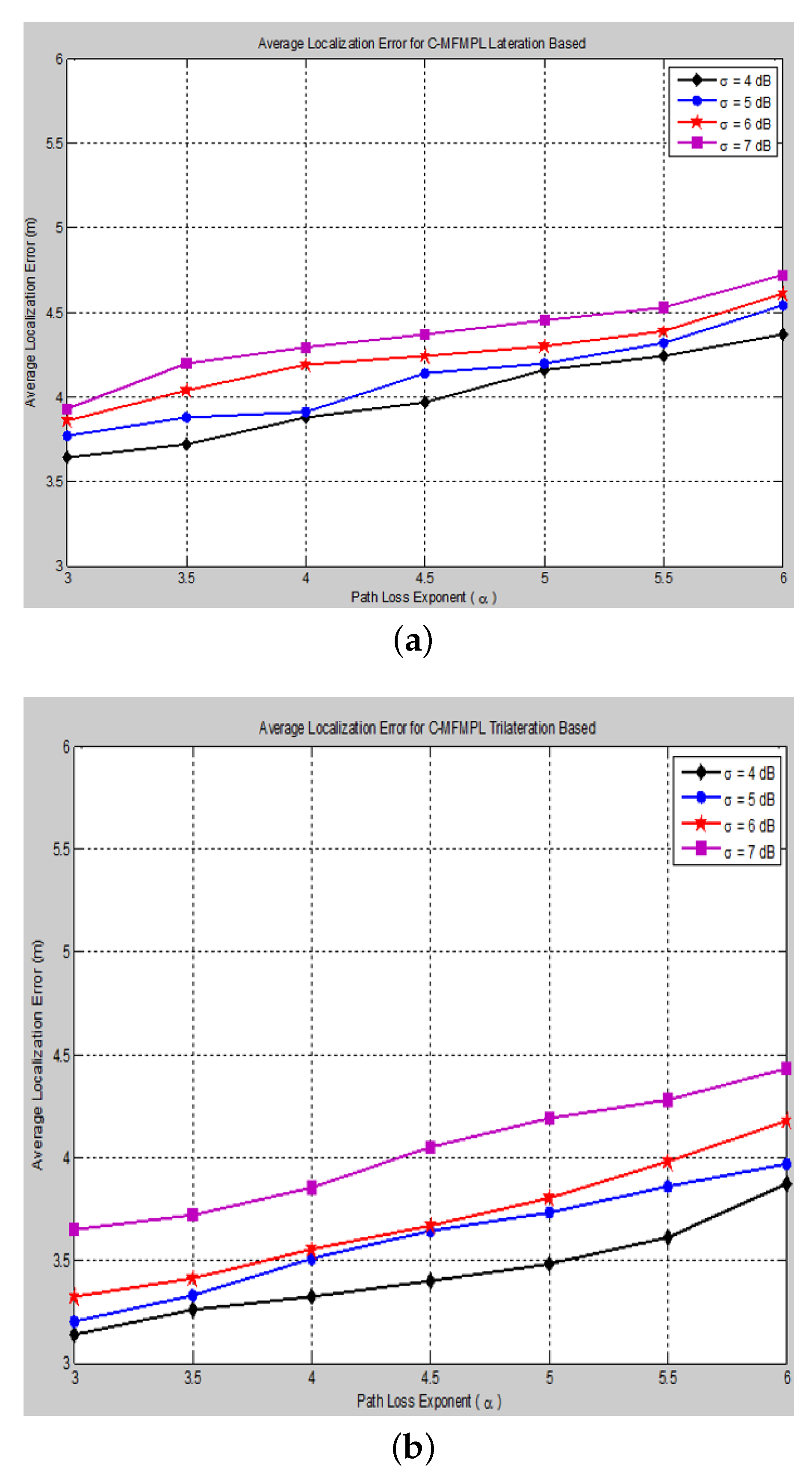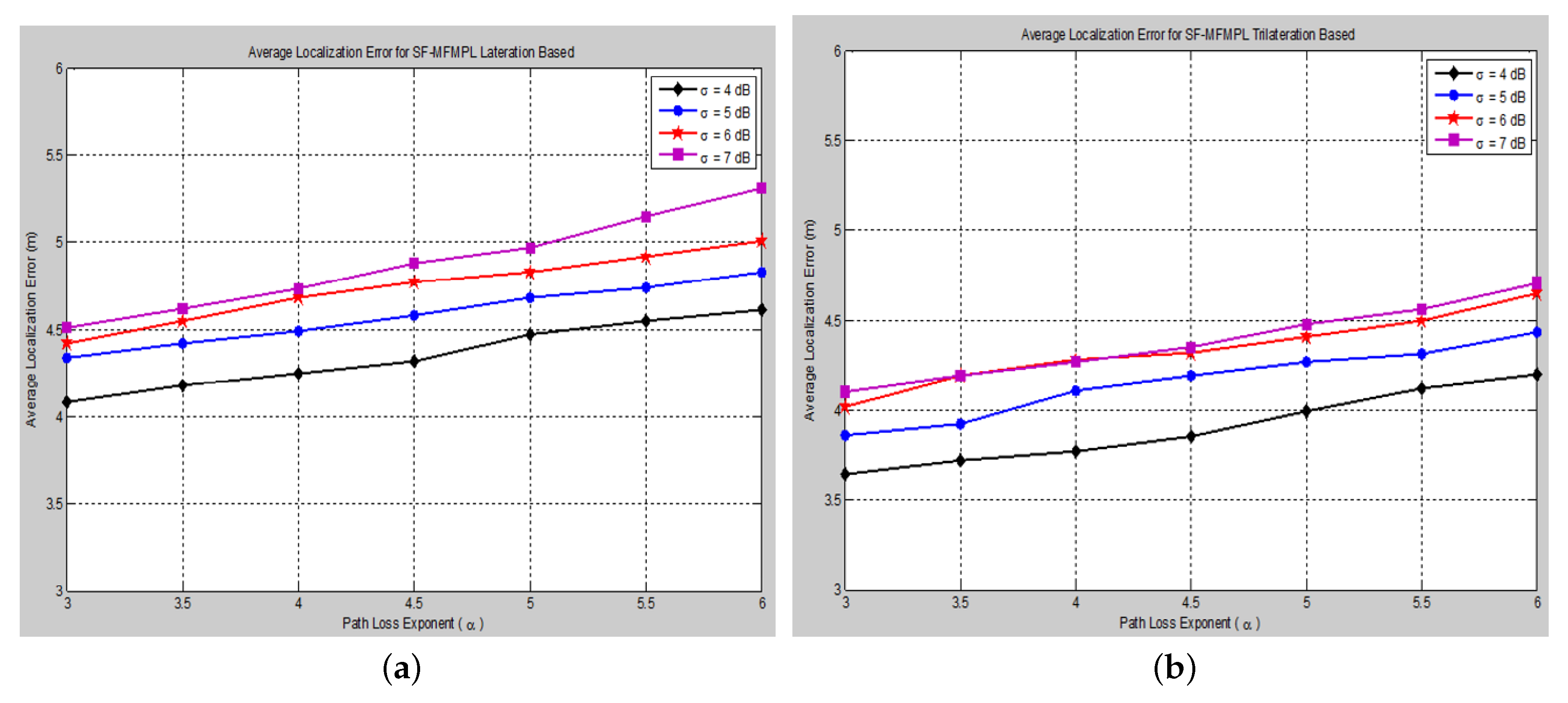 Figure 11. Average localization error versus different path loss exponent values for the SF-MFMPL algorithm (No. of barriers = 10, APs = 20). (a) Lateration technique based; (b) Trilateration technique based.