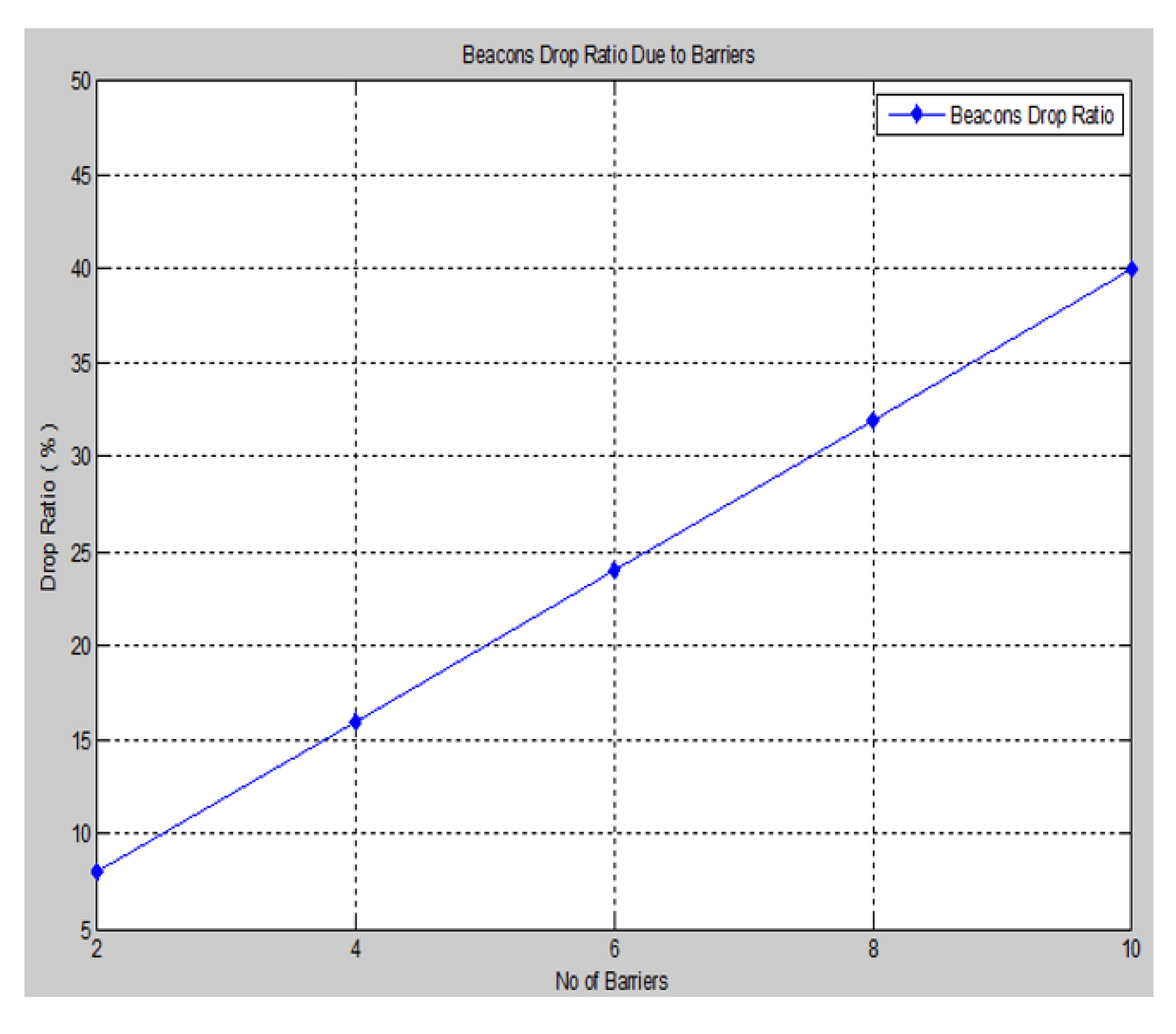 We observe from the figure above that as the number of barriers increases, a greater number of invalid beacons will appear in the network, and drop ratio is increased, as well. In spite of the 40% invalid beacon drop rate from the case of 10 barriers, the performance of our proposed approach is still accurate and contributes to a lesser localization error.