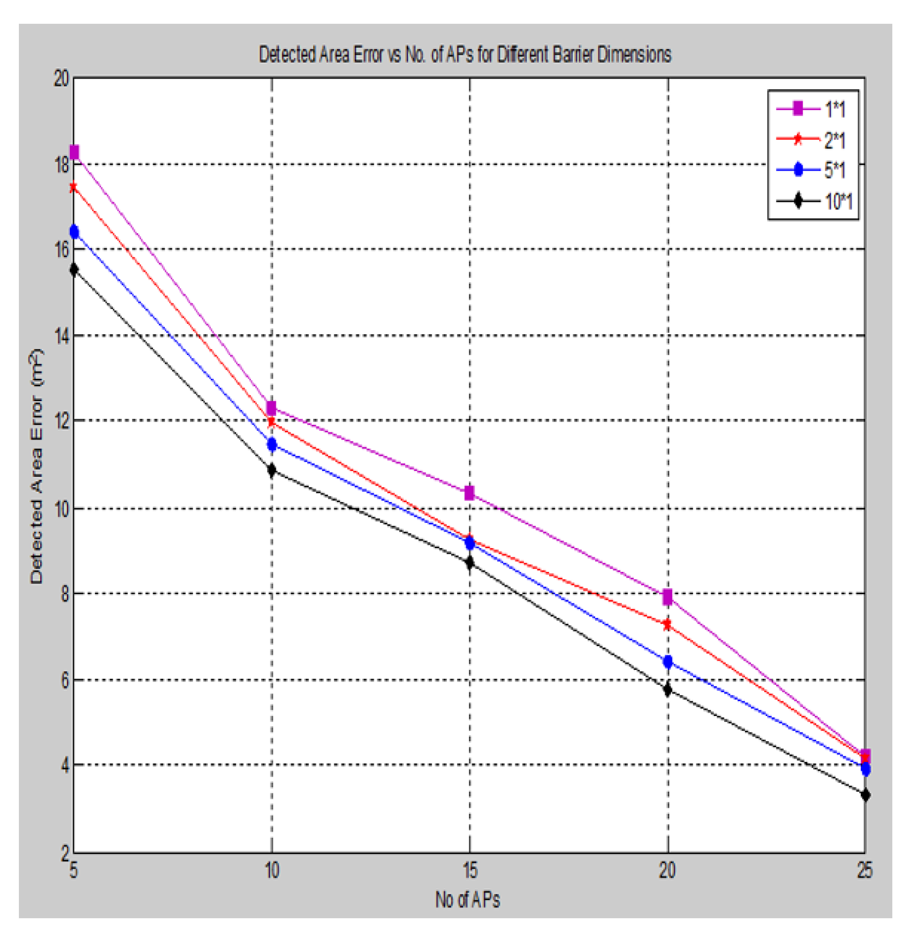 Based on the simulation results above, we observe that as the number of anchors (APs) increases, the detected area error reduces greatly, as well as the optimum placement configuration of anchors (APs) around the perimeter showed more accurate performance through identifying the attack area with great precision.