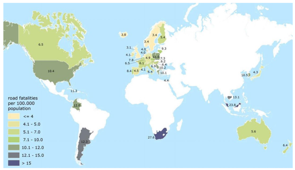 Road fatalities per 100,000 population in 2011 (International Road Traffic and Accident Database (IRTAD) annual road safety report 2013) [18].