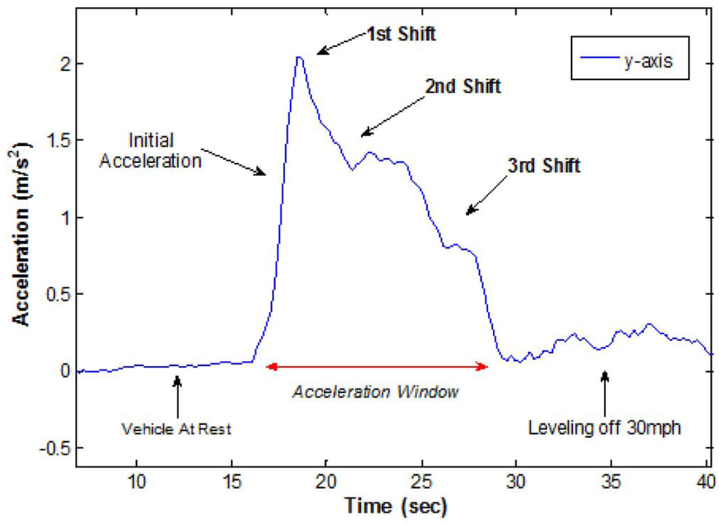 Engine gear shift analysis of a vehicle based on the y-axis accelerometer data [38].