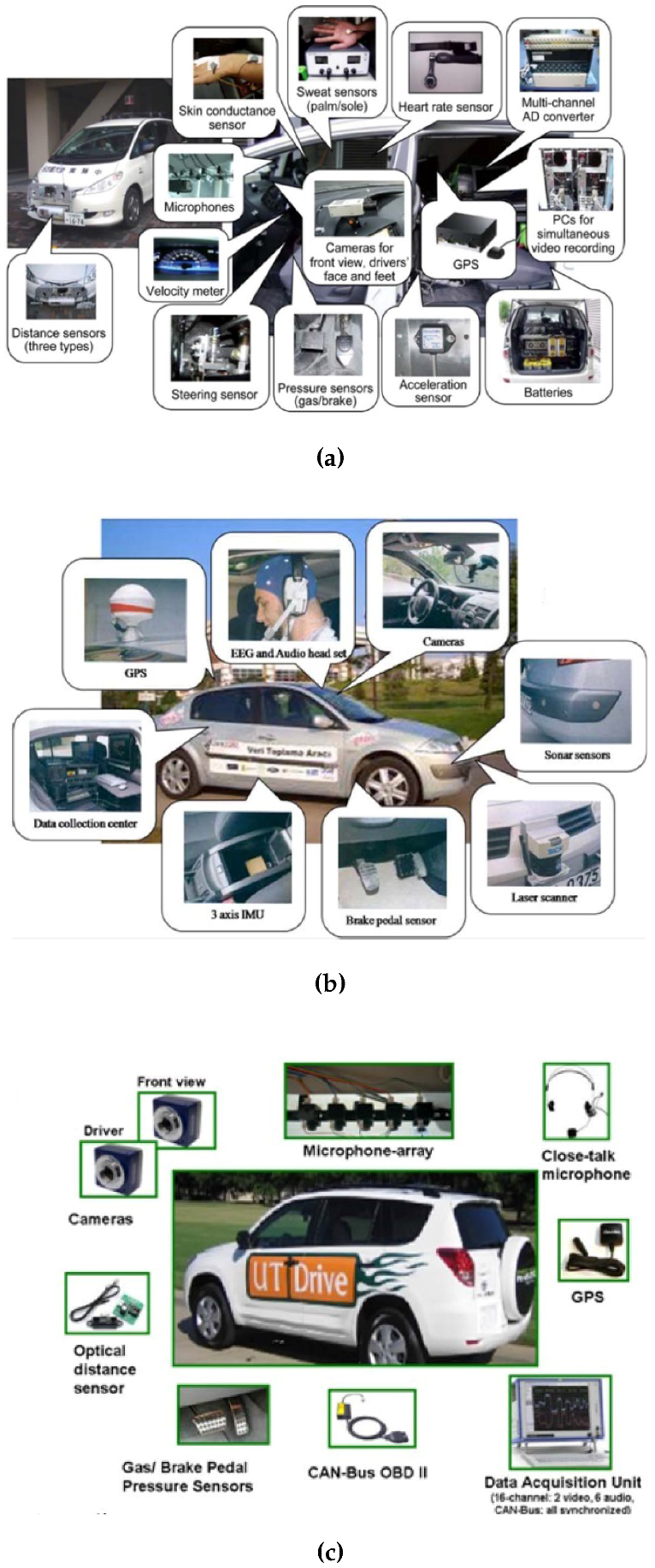 Sensors used for data collection in intelligent and autonomous vehicle studies [41]. (a) NUDrive; (b) Uyanik; (c) UTDrive.