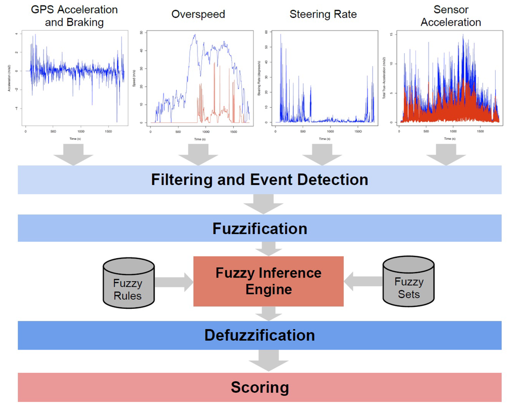 The behaviour and integrity of a driver is essential in fleet management and fleet optimisation, as the driver takes responsibility for the fleet vehicle, which is a costly company asset, as well as the vehicle’s load. Therefore, driver performance scoring practices can prove valuable in assessing the risk of an individual driver. Such applications include SenseFleet [43], which identifies risky manoeuvres performed by the driver using a Fuzzy Inference System (FIS). Evaluation experiments on SenseFleet have resulted in accurate identification of risky driving manoeuvres based on acceleration, braking and cornering actions, and also provided representative scores for a large number of test cases. Another functionality of SenseFleet provides road network and traffic information feedback, which aids in the tasks of fleet management and route optimization.