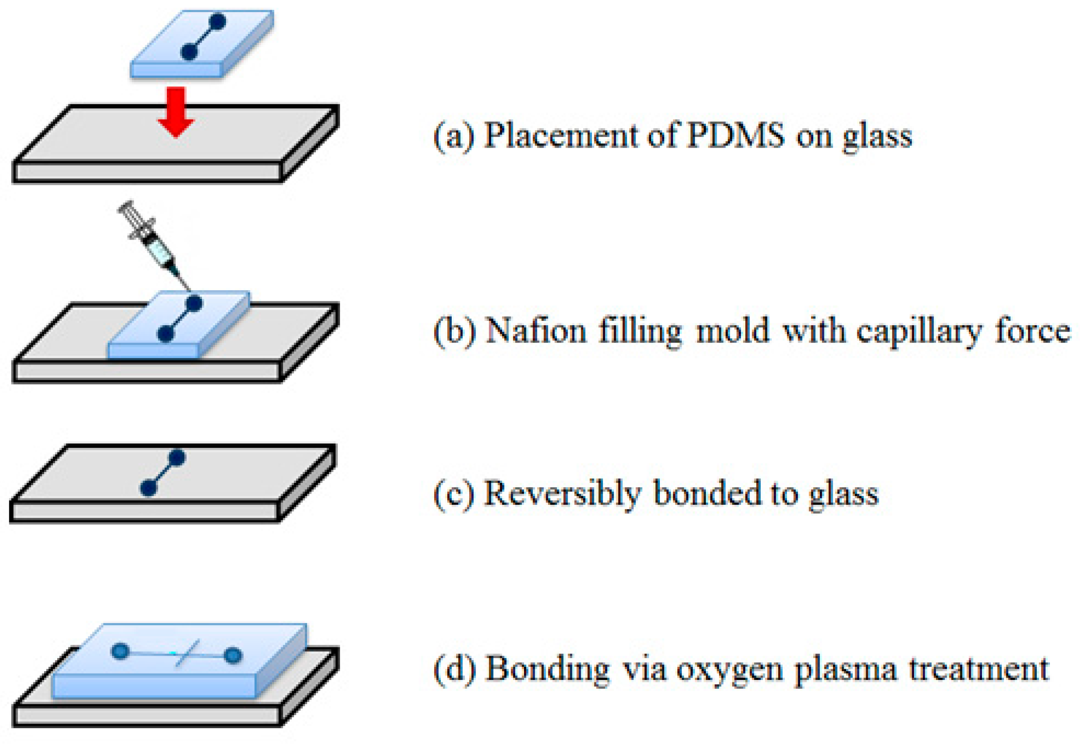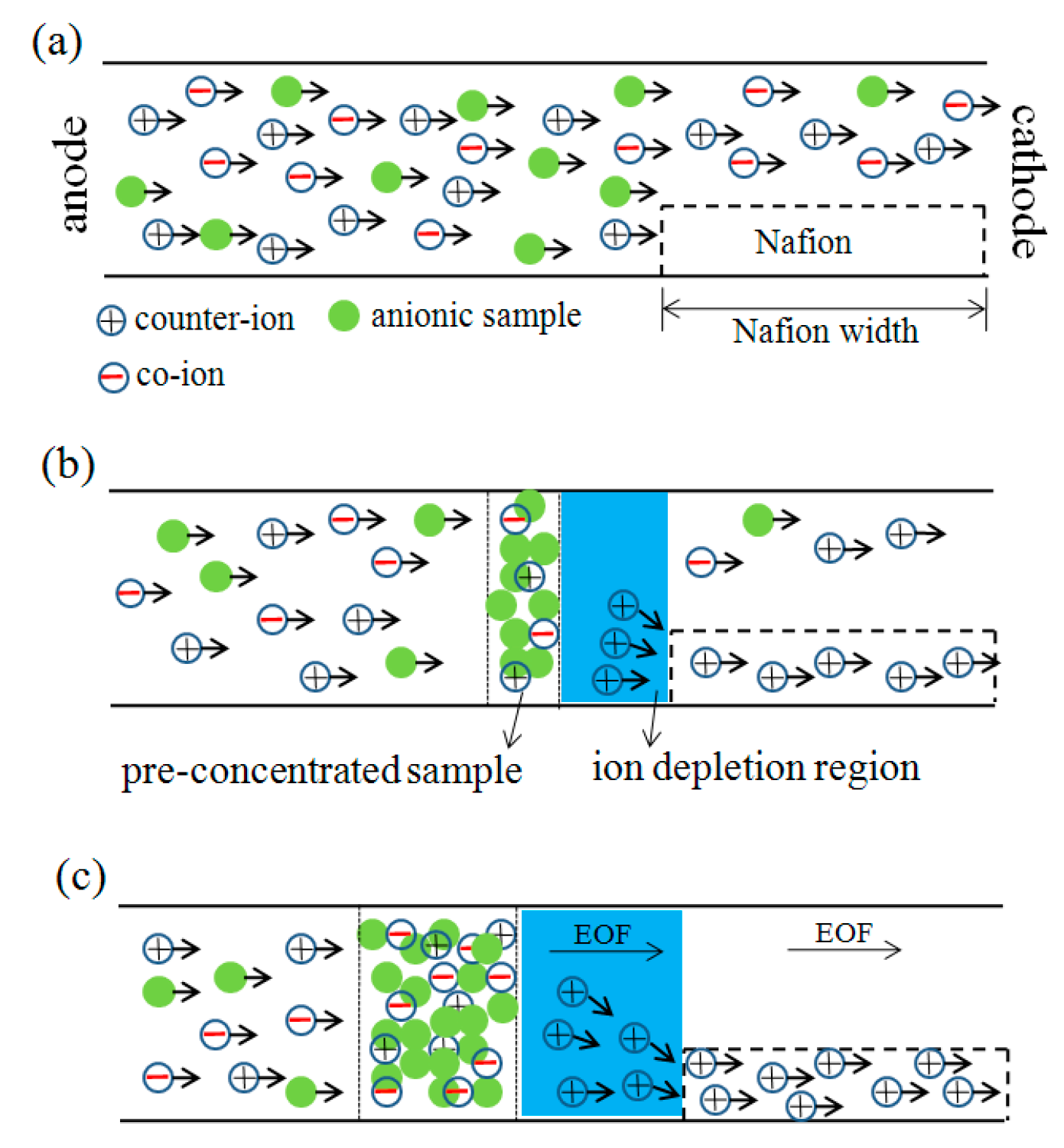Figure 3a, the combination of electroosmotic flow and migrations of charges makes the net flow to the right direction. Since the Nafion membrane becomes ion-selective due to the formation of double layer overlapping in the nanoporous membrane, a greater number of counter-ions pass through the Nafion membrane than co-ions. As a result, the concentration of co-ions on the left side of the nano-micro interface increases, while that of the counter-ions reduces. In other words, an ionic concentration polarization (ICP) effect occurs in which the concentration of the sample molecules gradually increases over time on the left side of the microchannel/Nafion membrane interface, as illustrated in