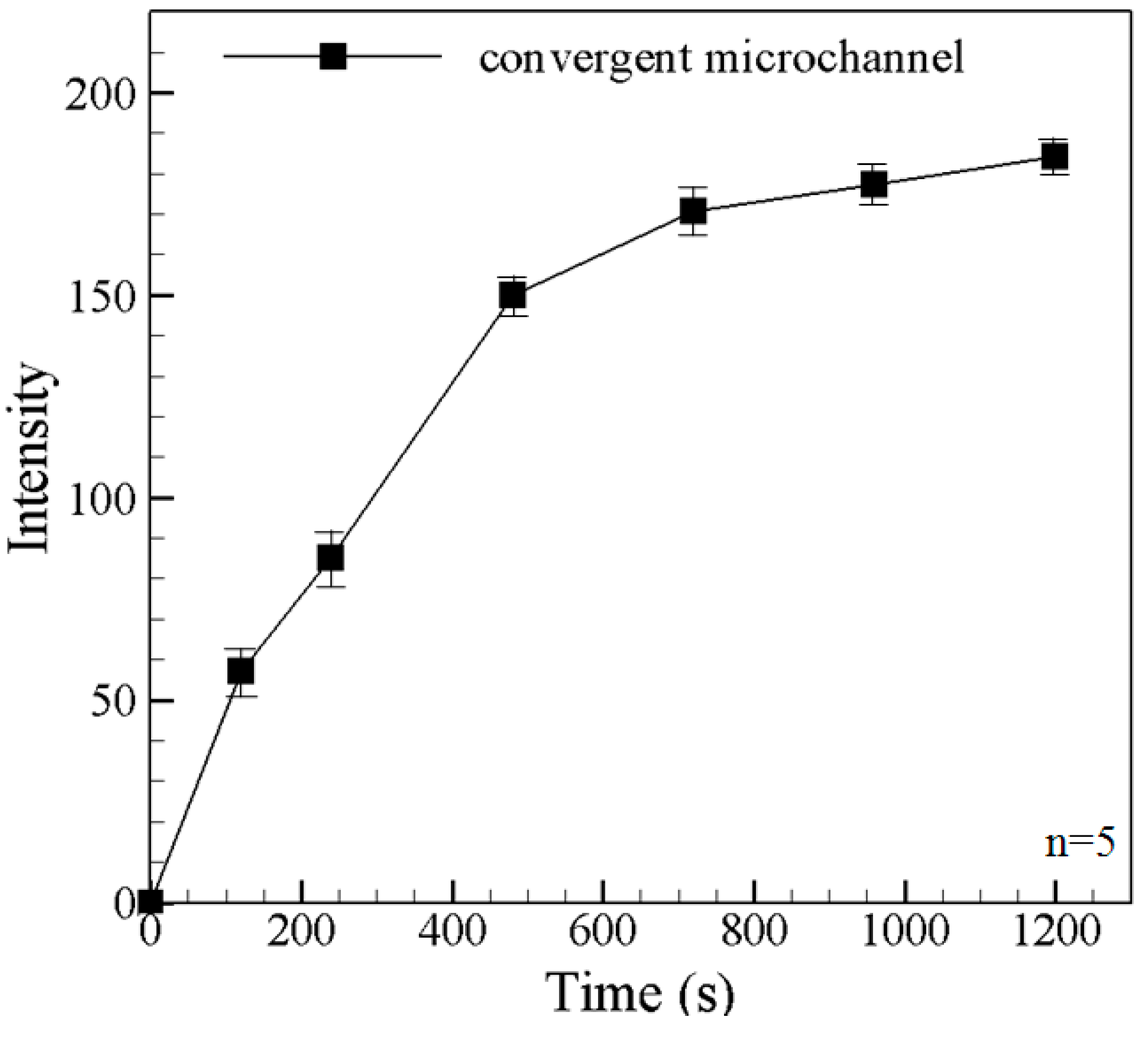 Figure 4 shows the variation of the measured fluorescence intensity in the microchannel over an observation period of 1200 s. For a preconcentration time of less than approximately 500 s, the fluorescence intensity in the microchannel is nearly increased with time. After 720 s, the concentrated sample moves into the convergent channel. Due to smaller space in the convergent part of the channel, the fluorescein intensity continues to increase [