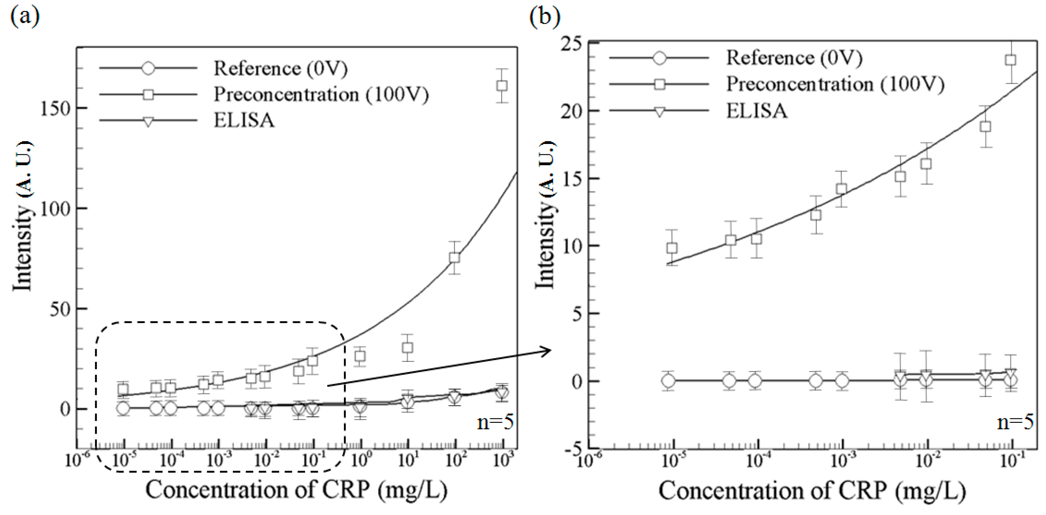 Figure 5a compares the detection performance of the microchip with that of a conventional ELISA system (EZ Read 400, Biochrom, Holliston, MA,USA) using the Human C-Reactive Protein ELISA Kit (Cell Biolabs, Inc. San Diego, CA, USA). Note that the fluorescence intensity data represent themaximum value obtained in the corresponding test. The solid circle line indicates the fluorescence intensity measured in the microchip in the absence of a driving voltage. Meanwhile, the solid square line shows the measured fluorescence intensity given the application of a driving voltage of 100 V. Comparing the two lines, it is seen that for all values of the initial CRP concentration, the ICP effect results in a significant increase in the fluorescence intensity. The enhancement in the fluorescence intensity is particularly apparent in the samples with a higher initial CRP concentration. The solid triangular line shows the fluorescence intensity values obtained by the ELISA system. It is noted that for initial CRP concentrations less than 4.76 × 10