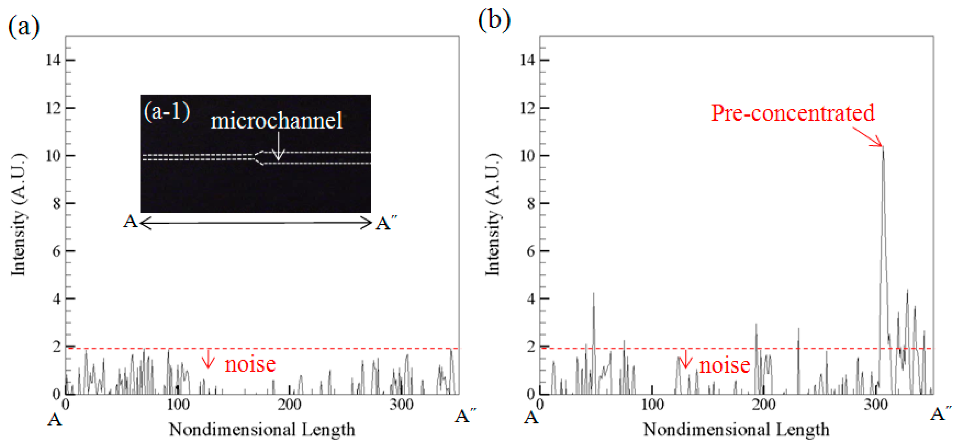 (a) The measured intensity along the microchannel A-A˝ when the device contains buffer only; (b) The measured intensity along A-A˝ when the device contains both buffer and 9.5 × 10−6 mg/L CRP under the pre-concentration operation.